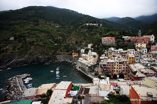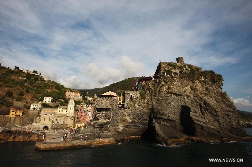 Photo taken on Sept. 26, 2013 shows a view of Vernazza of Cinque Terre of Italy. The Cinque Terre meaning five towns indicates Riomaggiore, Manarola, Corniglia, Vernazza and Monterosso located from south to north on Ligurian coast. The layout and disposition of the small towns and the shaping of the surrounding landscape, overcoming the disadvantages of a steep, uneven terrain, encapsulate the continuous history of human settlement in this region over the past millennium. In 1997 Porto Venere and the villages of Cinque Terre were designated by UNESCO as a World Heritage Site. (Xinhua/Du Juanjuan)