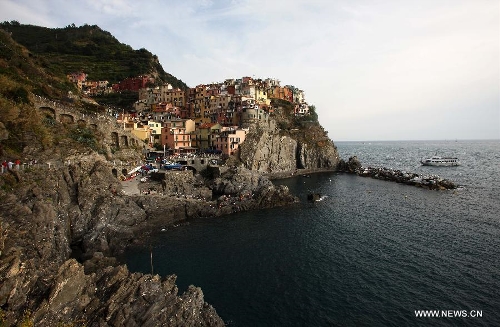 Photo taken on Sept. 26, 2013 shows a view of Manarola of Cinque Terre of Italy. The Cinque Terre meaning five towns indicates Riomaggiore, Manarola, Corniglia, Vernazza and Monterosso located from south to north on Ligurian coast. The layout and disposition of the small towns and the shaping of the surrounding landscape, overcoming the disadvantages of a steep, uneven terrain, encapsulate the continuous history of human settlement in this region over the past millennium. In 1997 Porto Venere and the villages of Cinque Terre were designated by UNESCO as a World Heritage Site. (Xinhua/Du Juanjuan)