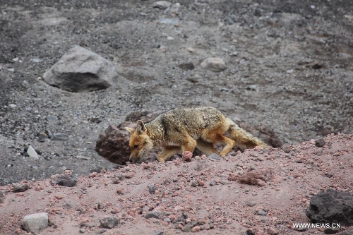 A fox is seen at the mountainside of the Cotopaxi Volcano, some 60 kilometers south of Quito, Ecuador, Oct. 1, 2013. The Cotopaxi Volcano, one of the highest active volcanoes in the world, is the second highest mountain in Ecuador with a height of 5,896 meters. (Xinhua/Liang Junqian)