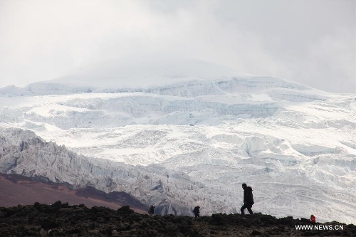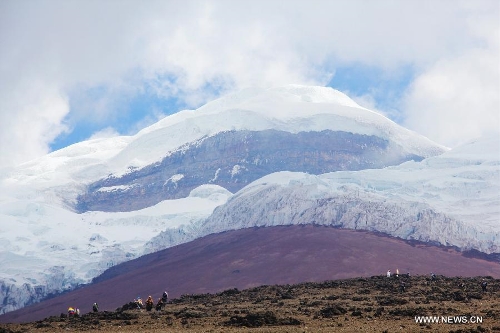Visitors climb the Cotopaxi Volcano, some 60 kilometers south of Quito, Ecuador, Oct. 1, 2013. The Cotopaxi Volcano, one of the highest active volcanoes in the world, is the second highest mountain in Ecuador with a height of 5,896 meters. (Xinhua/Liang Junqian)