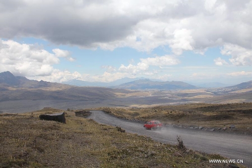 A car travels at the foot of the Cotopaxi Volcano, some 60 kilometers south of Quito, Ecuador, Oct. 1, 2013. The Cotopaxi Volcano, one of the highest active volcanoes in the world, is the second highest mountain in Ecuador with a height of 5,896 meters. (Xinhua/Liang Junqian)