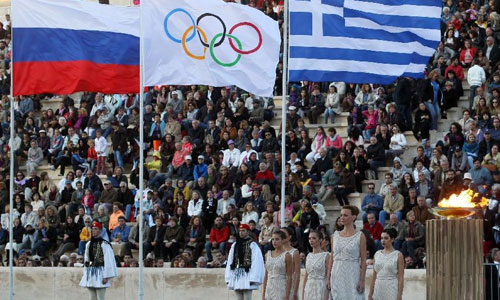 The Russian national flag, the Olympic flag and the Greek national flag (above ,L-R) are seen during the handover ceremony of the Olympic flame for the Sochi 2014 Olympic Winter Games, at the Panathenaic stadium in Athens, October 5, 2013. Photo: Xinhua