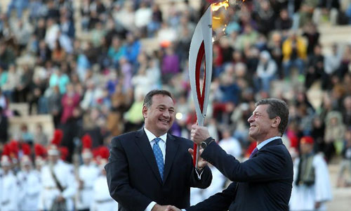 Spyros Kapralos (L), president of the Greek Olympic Committee, hands over the torch to Dmitry Kozak, Deputy Prime Minister of the Russian Federation during the handover ceremony of the Olympic flame for the Sochi 2014 Olympic Winter Games, at the Panathenaic stadium in Athens, October 5, 2013. Photo: Xinhua