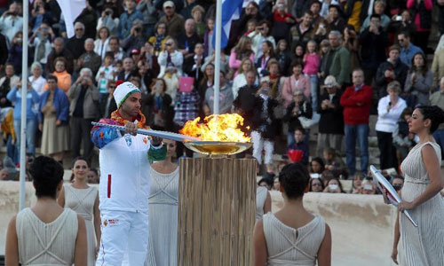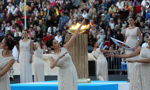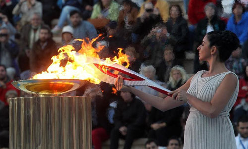 Actress Ino Menegaki who plays a high priestess lights a torch with the Olympic flame during the handover ceremony of the Olympic flame for the Sochi 2014 Olympic Winter Games, at the Panathenaic stadium in Athens, October 5, 2013. Photo: Xinhua