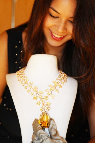 The L'Incomparable Diamond necklace is displayed by Jeweller Mouawad during a media preview ahead of the Singapore JewelFest which will be held on Oct. 11 to 15 in Singapore, Oct. 4, 2013. (Xinhua/Then Chih Wey)