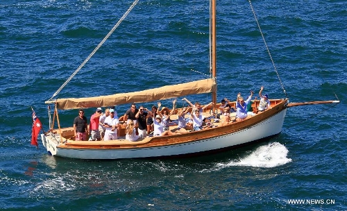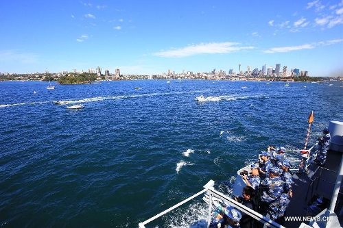 People see off Chinese People's Liberation Army Navy destroyer Qingdao in a sailing boat at Sydney Harbor, Sydney, Australia, Oct. 6, 2013. Destroyer Qingdao arrived in Sydney Harbor on Oct. 1 to take part in a historic International Fleet Review, which commemorates the centenary of the first entry of the Royal Australian Navy Fleet into Sydney. (Xinhua/Zha Chunming)