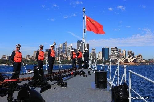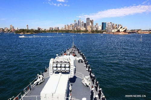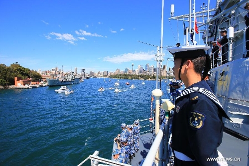 Marines stand on the deck as Chinese People's Liberation Army Navy destroyer Qingdao prepares to sail out of Sydney Harbor, Sydney, Australia, Oct. 6, 2013. Destroyer Qingdao arrived in Sydney Harbor on Oct. 1 to take part in a historic International Fleet Review, which commemorates the centenary of the first entry of the Royal Australian Navy Fleet into Sydney. (Xinhua/Zha Chunming)