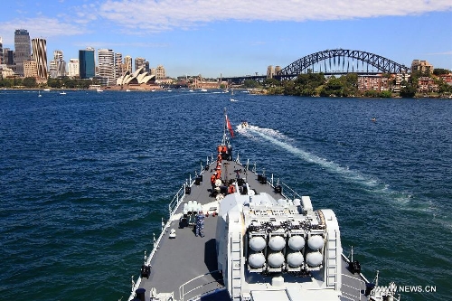 Marines stand on the deck as Chinese People's Liberation Army Navy destroyer Qingdao sails out of Sydney Harbor, Sydney, Australia, Oct. 6, 2013. Destroyer Qingdao arrived in Sydney Harbor on Oct. 1 to take part in a historic International Fleet Review, which commemorates the centenary of the first entry of the Royal Australian Navy Fleet into Sydney. (Xinhua/Zha Chunming)