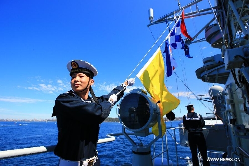 A marine displays signal flag when Chinese People's Liberation Army Navy destroyer Qingdao sails out of Sydney Harbor, Sydney, Australia, Oct. 6, 2013. Destroyer Qingdao arrived in Sydney Harbor on Oct. 1 to take part in a historic International Fleet Review, which commemorates the centenary of the first entry of the Royal Australian Navy Fleet into Sydney. (Xinhua/Zha Chunming)
