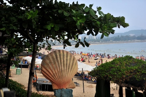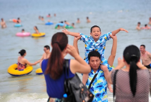 Tourists pose for a photo on a beach in Sanya, a popular resort city in south China's Hainan Province, Oct. 6, 2013. During the seven-day national holidays since Oct. 1, many people came to the seaside to enjoy their leisure time. (Xinhua/Zhang Yongfeng)