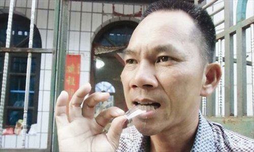 Cement worker and amateur magician Chen Yawen eats a light bulb shard in Zhangzhou, Fujian Province. Chen claims to have been eating bulbs for nearly 30 years. Photo: taihainet.com
