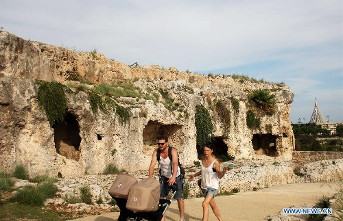 A couple walk past on Oct. 7, 2013 shows a view of the grave niches on the terrace above the greek theatre in Syracuse, Italy. Ancient Syracuse includes the nucleus of the city's foundation as Ortygia by Greeks from Corinth in the 8th century BC. The site of the city, which Cicero described as 'the greatest Greek city and the most beautiful of all', retains vestiges such as the Temple of Athena (5th century BC, later transformed to serve as a cathedral), a Greek theatre, a Roman amphitheatre, a fort and more. Many remains bear witness to the troubled history of Sicily, from the Byzantines to the Bourbons, interspersed with the Arab-Muslims, the Normans, Frederick II of the Hohenstaufen dynasty (1197--1250), the Aragons and the Kingdom of the Two Sicilies. Historic Syracuse offers a unique testimony to the development of Mediterranean civilization over three millennia. The UNESCO Commitee inscribed Syracuse as a world heritage site in 2005. (Xinhua/Du Juanjuan)