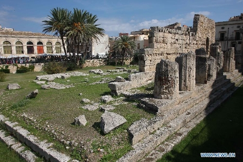 Photo taken on Oct. 7, 2013 shows a view of the Temple of Apollo in Syracuse of Italy. Ancient Syracuse includes the nucleus of the city's foundation as Ortygia by Greeks from Corinth in the 8th century BC. The site of the city, which Cicero described as 'the greatest Greek city and the most beautiful of all', retains vestiges such as the Temple of Athena (5th century BC, later transformed to serve as a cathedral), a Greek theatre, a Roman amphitheatre, a fort and more. Many remains bear witness to the troubled history of Sicily, from the Byzantines to the Bourbons, interspersed with the Arab-Muslims, the Normans, Frederick II of the Hohenstaufen dynasty (1197--1250), the Aragons and the Kingdom of the Two Sicilies. Historic Syracuse offers a unique testimony to the development of Mediterranean civilization over three millennia. The UNESCO Commitee inscribed Syracuse as a world heritage site in 2005. (Xinhua/Du Juanjuan)