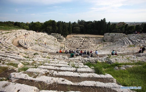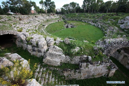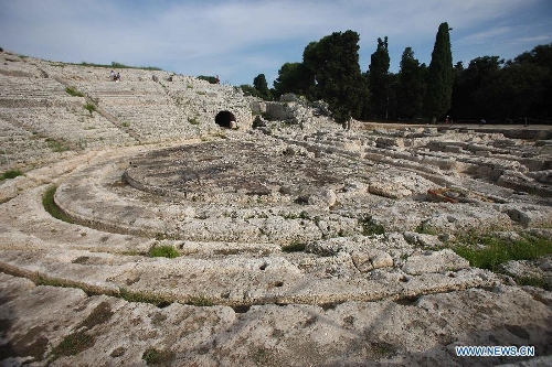 Photo taken on Oct. 7, 2013 shows the Greek theatre in Syracuse, Italy. Ancient Syracuse includes the nucleus of the city's foundation as Ortygia by Greeks from Corinth in the 8th century BC. The site of the city, which Cicero described as 'the greatest Greek city and the most beautiful of all', retains vestiges such as the Temple of Athena (5th century BC, later transformed to serve as a cathedral), a Greek theatre, a Roman amphitheatre, a fort and more. Many remains bear witness to the troubled history of Sicily, from the Byzantines to the Bourbons, interspersed with the Arab-Muslims, the Normans, Frederick II of the Hohenstaufen dynasty (1197--1250), the Aragons and the Kingdom of the Two Sicilies. Historic Syracuse offers a unique testimony to the development of Mediterranean civilization over three millennia. The UNESCO Commitee inscribed Syracuse as a world heritage site in 2005. (Xinhua/Du Juanjuan)