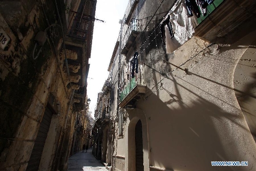 Photo taken on Oct. 7, 2013 shows the street view of Syracuse in Italy. Ancient Syracuse includes the nucleus of the city's foundation as Ortygia by Greeks from Corinth in the 8th century BC. The site of the city, which Cicero described as 'the greatest Greek city and the most beautiful of all', retains vestiges such as the Temple of Athena (5th century BC, later transformed to serve as a cathedral), a Greek theatre, a Roman amphitheatre, a fort and more. Many remains bear witness to the troubled history of Sicily, from the Byzantines to the Bourbons, interspersed with the Arab-Muslims, the Normans, Frederick II of the Hohenstaufen dynasty (1197--1250), the Aragons and the Kingdom of the Two Sicilies. Historic Syracuse offers a unique testimony to the development of Mediterranean civilization over three millennia. The UNESCO Commitee inscribed Syracuse as a world heritage site in 2005. (Xinhua/Du Juanjuan)