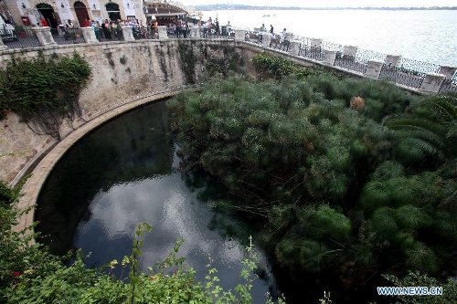 Photo taken on Oct. 7, 2013 shows the Aretusa Spring in Syracuse, Italy. Ancient Syracuse includes the nucleus of the city's foundation as Ortygia by Greeks from Corinth in the 8th century BC. The site of the city, which Cicero described as 'the greatest Greek city and the most beautiful of all', retains vestiges such as the Temple of Athena (5th century BC, later transformed to serve as a cathedral), a Greek theatre, a Roman amphitheatre, a fort and more. Many remains bear witness to the troubled history of Sicily, from the Byzantines to the Bourbons, interspersed with the Arab-Muslims, the Normans, Frederick II of the Hohenstaufen dynasty (1197--1250), the Aragons and the Kingdom of the Two Sicilies. Historic Syracuse offers a unique testimony to the development of Mediterranean civilization over three millennia. The UNESCO Commitee inscribed Syracuse as a world heritage site in 2005. (Xinhua/Du Juanjuan)