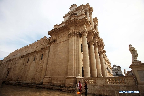 Photo taken on Oct. 7, 2013 shows the Duomo in Syracuse, Italy. Ancient Syracuse includes the nucleus of the city's foundation as Ortygia by Greeks from Corinth in the 8th century BC. The site of the city, which Cicero described as 'the greatest Greek city and the most beautiful of all', retains vestiges such as the Temple of Athena (5th century BC, later transformed to serve as a cathedral), a Greek theatre, a Roman amphitheatre, a fort and more. Many remains bear witness to the troubled history of Sicily, from the Byzantines to the Bourbons, interspersed with the Arab-Muslims, the Normans, Frederick II of the Hohenstaufen dynasty (1197--1250), the Aragons and the Kingdom of the Two Sicilies. Historic Syracuse offers a unique testimony to the development of Mediterranean civilization over three millennia. The UNESCO Commitee inscribed Syracuse as a world heritage site in 2005. (Xinhua/Du Juanjuan)