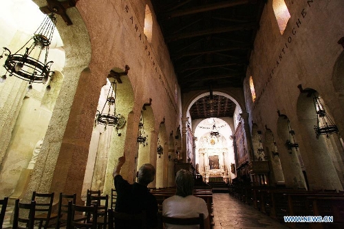 A couple look at the interior of the Duomo in Syracuse, Italy, Oct. 7, 2013. Ancient Syracuse includes the nucleus of the city's foundation as Ortygia by Greeks from Corinth in the 8th century BC. The site of the city, which Cicero described as 'the greatest Greek city and the most beautiful of all', retains vestiges such as the Temple of Athena (5th century BC, later transformed to serve as a cathedral), a Greek theatre, a Roman amphitheatre, a fort and more. Many remains bear witness to the troubled history of Sicily, from the Byzantines to the Bourbons, interspersed with the Arab-Muslims, the Normans, Frederick II of the Hohenstaufen dynasty (1197--1250), the Aragons and the Kingdom of the Two Sicilies. Historic Syracuse offers a unique testimony to the development of Mediterranean civilization over three millennia. The UNESCO Commitee inscribed Syracuse as a world heritage site in 2005. (Xinhua/Du Juanjuan)