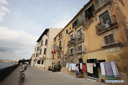 A woman does laundry outside her house along the seaside in Syracuse, Italy, Oct. 7, 2013. Ancient Syracuse includes the nucleus of the city's foundation as Ortygia by Greeks from Corinth in the 8th century BC. The site of the city, which Cicero described as 'the greatest Greek city and the most beautiful of all', retains vestiges such as the Temple of Athena (5th century BC, later transformed to serve as a cathedral), a Greek theatre, a Roman amphitheatre, a fort and more. Many remains bear witness to the troubled history of Sicily, from the Byzantines to the Bourbons, interspersed with the Arab-Muslims, the Normans, Frederick II of the Hohenstaufen dynasty (1197--1250), the Aragons and the Kingdom of the Two Sicilies. Historic Syracuse offers a unique testimony to the development of Mediterranean civilization over three millennia. The UNESCO Commitee inscribed Syracuse as a world heritage site in 2005. (Xinhua/Du Juanjuan)