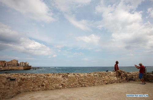 A couple take photos at the seaside in Syracuse, Italy, Oct. 7, 2013. Ancient Syracuse includes the nucleus of the city's foundation as Ortygia by Greeks from Corinth in the 8th century BC. The site of the city, which Cicero described as 'the greatest Greek city and the most beautiful of all', retains vestiges such as the Temple of Athena (5th century BC, later transformed to serve as a cathedral), a Greek theatre, a Roman amphitheatre, a fort and more. Many remains bear witness to the troubled history of Sicily, from the Byzantines to the Bourbons, interspersed with the Arab-Muslims, the Normans, Frederick II of the Hohenstaufen dynasty (1197--1250), the Aragons and the Kingdom of the Two Sicilies. Historic Syracuse offers a unique testimony to the development of Mediterranean civilization over three millennia. The UNESCO Commitee inscribed Syracuse as a world heritage site in 2005. (Xinhua/Du Juanjuan)