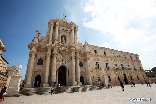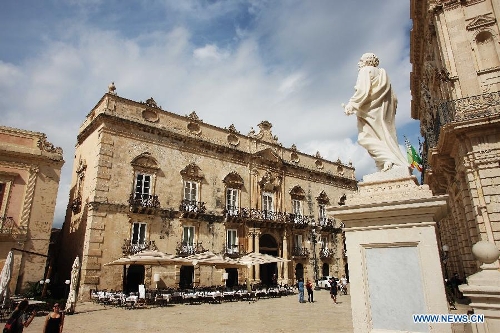 Photo taken on Oct. 7, 2013 shows the square in front of the Duomo in Syracuse, Italy. Ancient Syracuse includes the nucleus of the city's foundation as Ortygia by Greeks from Corinth in the 8th century BC. The site of the city, which Cicero described as 'the greatest Greek city and the most beautiful of all', retains vestiges such as the Temple of Athena (5th century BC, later transformed to serve as a cathedral), a Greek theatre, a Roman amphitheatre, a fort and more. Many remains bear witness to the troubled history of Sicily, from the Byzantines to the Bourbons, interspersed with the Arab-Muslims, the Normans, Frederick II of the Hohenstaufen dynasty (1197--1250), the Aragons and the Kingdom of the Two Sicilies. Historic Syracuse offers a unique testimony to the development of Mediterranean civilization over three millennia. The UNESCO Commitee inscribed Syracuse as a world heritage site in 2005. (Xinhua/Du Juanjuan)