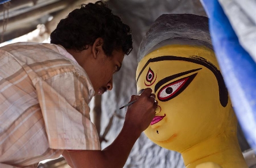 An Indian artist gives finishing touch to Durga idol at a makeshift pandal for the upcoming Durga Puja festival in Calcutta, capital of east India's West Bengal State, Oct. 8, 2013. Durga Puja, which will be celebrated from Oct. 10 to 14 involves worship of Hindu Goddess Durga, who symbolizes power and the triumph of good over evil in Hindu mythology. (Xinhua/Tumpa Mondal)