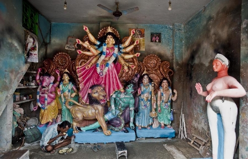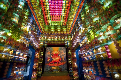 A makeshift pandal with an idol of Goddess Durga is pictured before the upcoming Durga Puja festival in Calcutta, capital of east India's West Bengal State, Oct. 8, 2013. Durga Puja, which will be celebrated from Oct. 10 to 14 involves worship of Hindu Goddess Durga, who symbolizes power and the triumph of good over evil in Hindu mythology. (Xinhua/Tumpa Mondal)