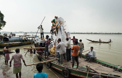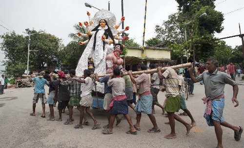 Indian workers carry an idol of Hindu goddess Durga to the worship venue for the upcoming Durga Puja festival in Calcutta, capital of east India's West Bengal State, Oct. 8, 2013. Durga Puja, which will be celebrated from Oct. 10 to 14 involves worship of Hindu Goddess Durga, who symbolizes power and the triumph of good over evil in Hindu mythology. (Xinhua/Tumpa Mondal)