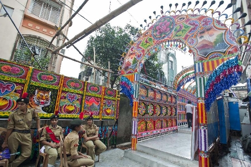 Indian girls guard outside a makeshift pandal for the upcoming Durga Puja festival in Calcutta, capital of east India's West Bengal State, Oct. 8, 2013. Durga Puja, which will be celebrated from Oct. 10 to 14 involves worship of Hindu Goddess Durga, who symbolizes power and the triumph of good over evil in Hindu mythology. (Xinhua/Tumpa Mondal)
