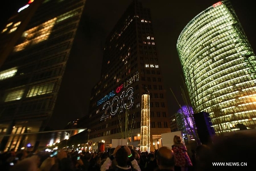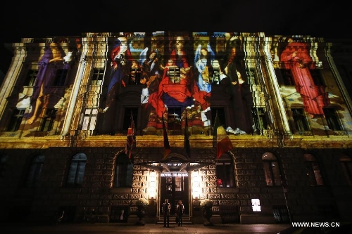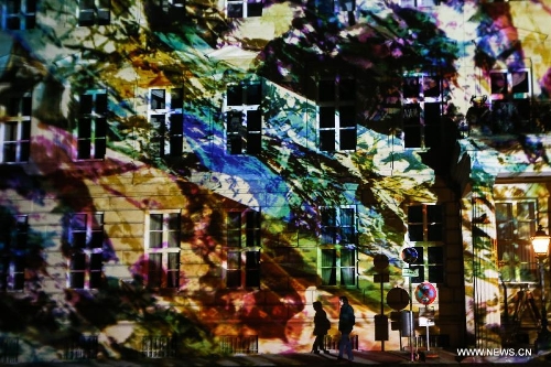 Part of the light art "Festival of Lights 2013" is seen on a building during the opening ceremony of the 9th Berlin Festival of Lights at the Potsdamer Platz square in Berlin, Germany, on Oct. 9, 2013. The festival, held from Oct. 9 to Oct. 20, transforms Berlin's world famous landmarks, cultural monuments, historical buildings, streets and other locations with light. (Xinhua/Zhang Fan)
