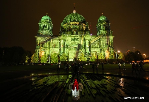 The Berlin Cathedral is illuminated during the 9th Berlin Festival of Lights in Berlin, Germany, on Oct. 9, 2013. The festival, held from Oct. 9 to Oct. 20, transforms Berlin's world famous landmarks, cultural monuments, historical buildings, streets and other locations with light. (Xinhua/Zhang Fan)