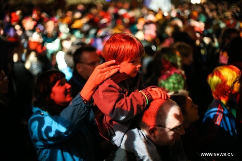 A boy watches with his parents the opening ceremony of the 9th Berlin Festival of Lights at the Potsdamer Platz square in Berlin, Germany, on Oct. 9, 2013. The festival, held from Oct. 9 to Oct. 20, transforms Berlin's world famous landmarks, cultural monuments, historical buildings, streets and other locations with light. (Xinhua/Zhang Fan)
