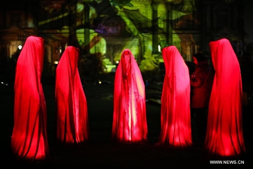 A tourist checks the installation "Keeper of Time" in front of the illuminated Berlin Cathedral during the 9th Berlin Festival of Lights in Berlin, Germany, on Oct. 9, 2013. The festival, held from Oct. 9 to Oct. 20, transforms Berlin's world famous landmarks, cultural monuments, historical buildings, streets and other locations with light. (Xinhua/Zhang Fan)