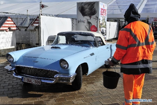 A man in orange uniforms stands next to a light blue vintage car wait for technique check of the Zoute Grand Prix in Knokke, Belgium, Oct 10, 2013. A total of 165 vintage cars, with more than 100 of them were built between 1920 and 1965, have registered for the 2-day rally this year which begins from Friday. (Xinhua/Ye Pingfan)