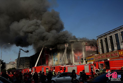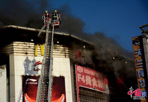 A shopping mall in Shijingshan District, west Beijing, caught fire early Friday morning. A total of 49 fire engines were dispatched to put out the fire. CCTV reported that the fire started from the workshop of the McDonald's in that mall. (Source: China.org.cn)