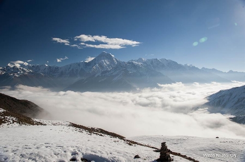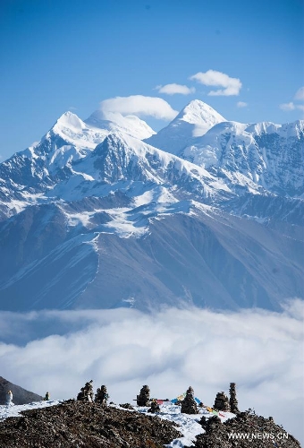 Photo taken on Oct. 15, 2013 shows the magnificent Minya Konka Mountain above thick clouds, in Kangding County, southwest China's Sichuan Province. Gongga Shan, or Minya Konka, is the "King of Sichuan Mountains" with the highest peak of 7,556 meters. Situated in the Daxue Shan mountain range on the eastern Tibetan plateau, it is a sacred mountain to the Tibetans, between Daduhe and Yalongjiang rivers. (Xinhua/Jiang Hongjing)
