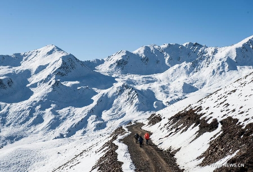 Tourists walk toward Zimei Village to view Minya Konka Mountain, in Kangding County, southwest China's Sichuan Province, Oct. 15, 2013. Gongga Shan, or Minya Konka, is the "King of Sichuan Mountains" with the highest peak of 7,556 meters. Situated in the Daxue Shan mountain range on the eastern Tibetan plateau, it is a sacred mountain to the Tibetans, between Daduhe and Yalongjiang rivers. (Xinhua/Jiang Hongjing)