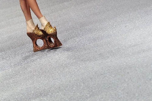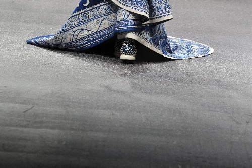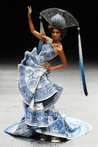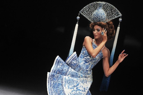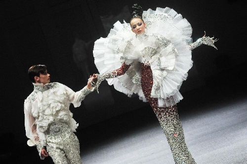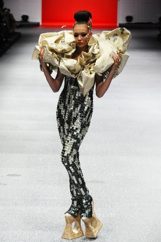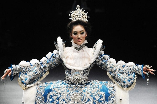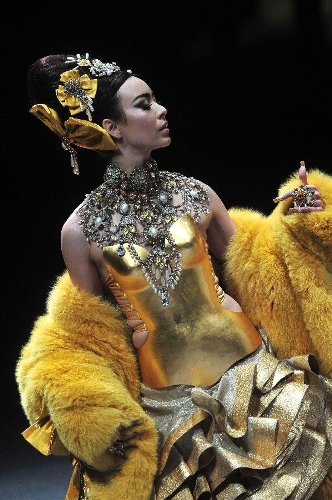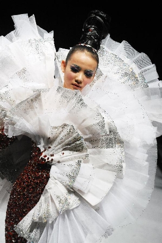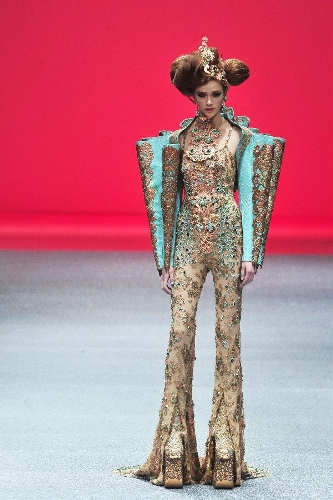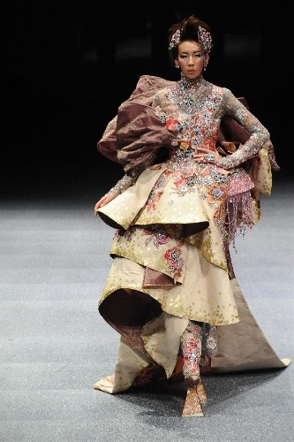 A model presents the latest creations by Chinese fashion designer Guo Pei during the FIDe Fashion Week in Singapore's Marina Bay Sands Expo, Oct. 16, 2013. (Xinhua/Then Chih Wey)