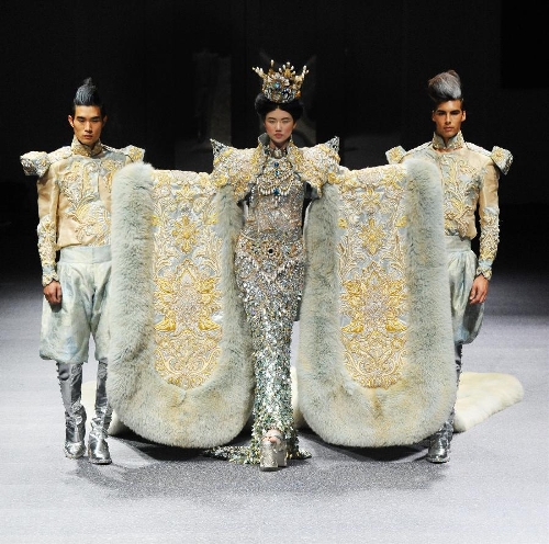 Chinese fashion designer Guo Pei (C) stands with her models as she acknowledges the audience during the FIDe Fashion Week in Singapore's Marina Bay Sands Expo, Oct. 16, 2013. (Xinhua/Then Chih Wey)