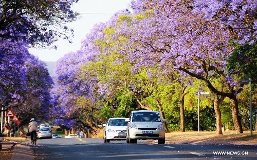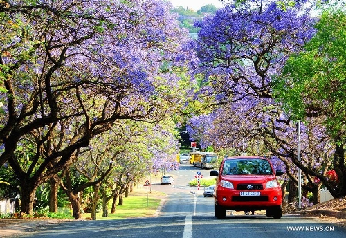 Cars run under the jacaranda trees in Pretoria, South Africa, Oct. 16, 2013. Purple flowers of Jacaranda blossom vigorously in Pretoria. (Xinhua/Zhang Chuanshi)