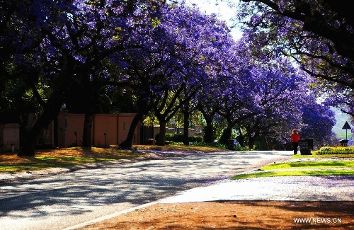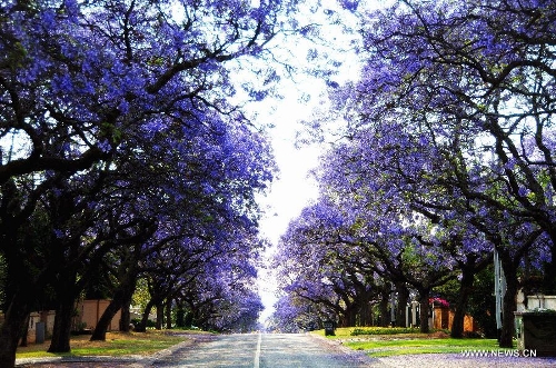 Jacaranda trees blossom in Pretoria, South Africa, Oct. 16, 2013. Purple flowers of Jacaranda blossom vigorously in Pretoria. (Xinhua/Zhang Chuanshi)