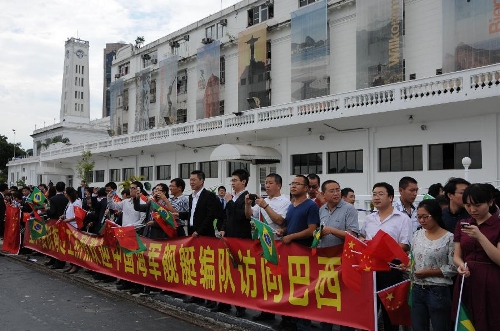 Overseas Chinese in Brazil and representatives of Chinese enterprises welcome Chinese Navy fleets at the port of Rio De Janeiro, Oct. 22, 2013. Two Chinese navy warships arrived here for a five-day goodwill visit to Brazil. (Xinhua/Zhao Yan)