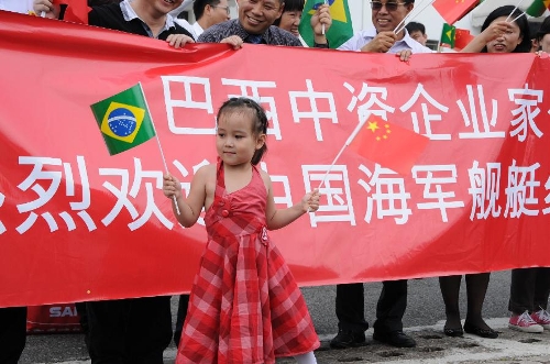 A girl holding Brazilian national flag welcomes Chinese Navy fleets at the port of Rio De Janeiro, Oct. 22, 2013. Two Chinese navy warships arrived here for a five-day goodwill visit to Brazil. (Xinhua/Zhao Yan)