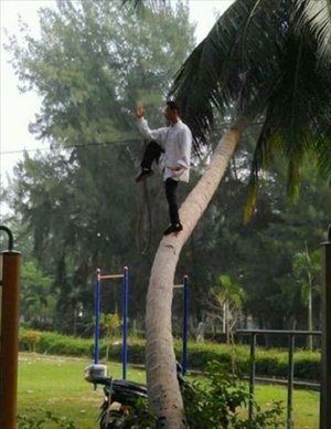 This man gives high kick a whole new meaning as he practices martial arts while balancing on the trunk of a coconut tree on the campus of Hainan University in Haikou, Hainan Province. Photos of the unidentified man were uploaded on October 24 and have since gone viral on various Chinese social networking sites. Photo: weibo. com