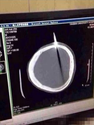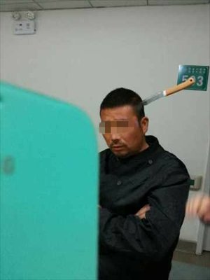 Photos of a man who had calmly walked into a Jilin Province hospital with a long knife sticking out from the side of his skull on the evening of October 25 has netizens scratching their heads over how it happened.