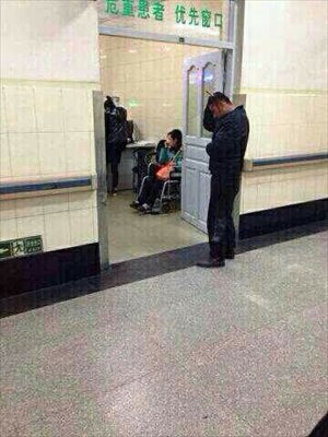The victim of the knife wound waits outside an examination room in Yanji Hospital on October 25. Photo: weibo.com