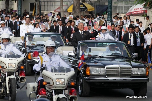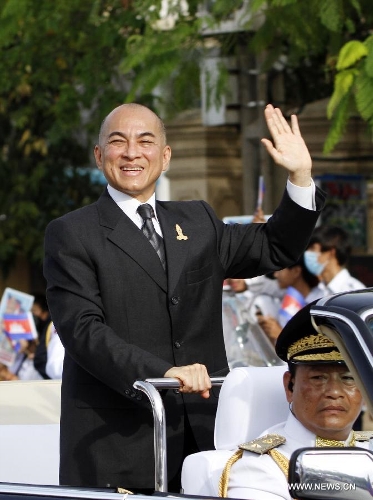 Cambodian King Norodom Sihamoni waves to the crowd while attending the independence day celebration in Phnom Penh, Cambodia, Nov. 9, 2013. Cambodia celebrated the 60th anniversary of its independence on Saturday. (Xinhua/Sovannara)