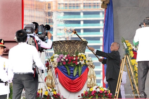 Cambodian King Norodom Sihamoni lights the victory torch inside the Independence Monument during the independence day celebration in Phnom Penh, Cambodia, Nov. 9, 2013. Cambodia celebrated the 60th anniversary of its independence on Saturday. (Xinhua/Sovannara)
