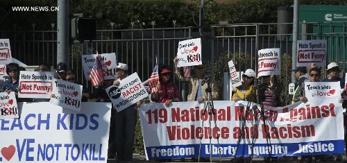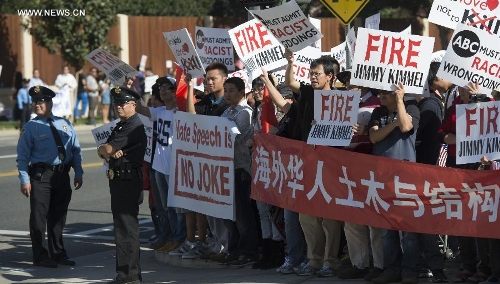 People rally in front of the headquarters of the American Broadcasting Company (ABC) to protest against its rhetoric of racial discrimination in Burbank, California, the United States, Nov. 9, 2013. (Xinhua/Yang Lei)