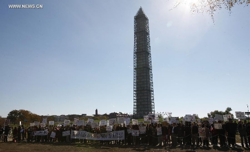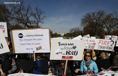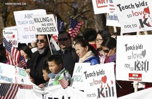 Chinese protesters gather during a protest against the rhetoric of racial discrimination of the American Broadcasting Company (ABC) in Washington D.C., Nov. 9, 2013. (Xinhua/Fang Zhe)